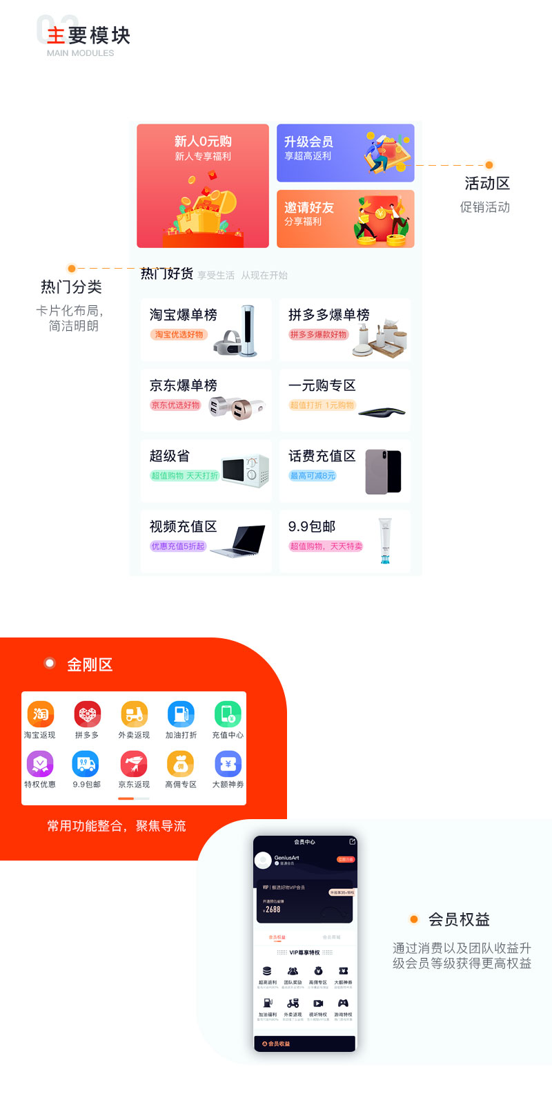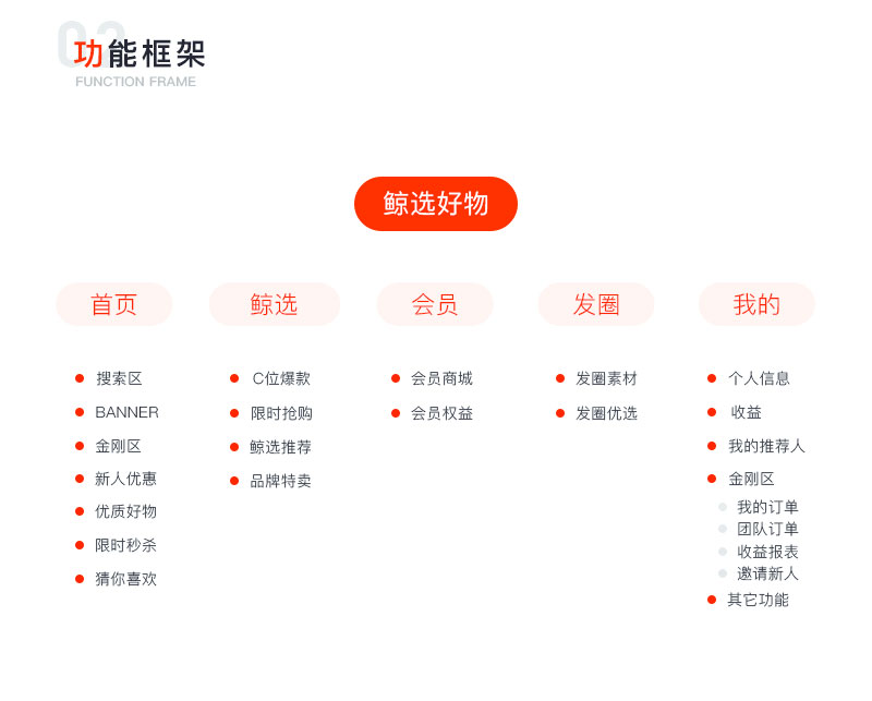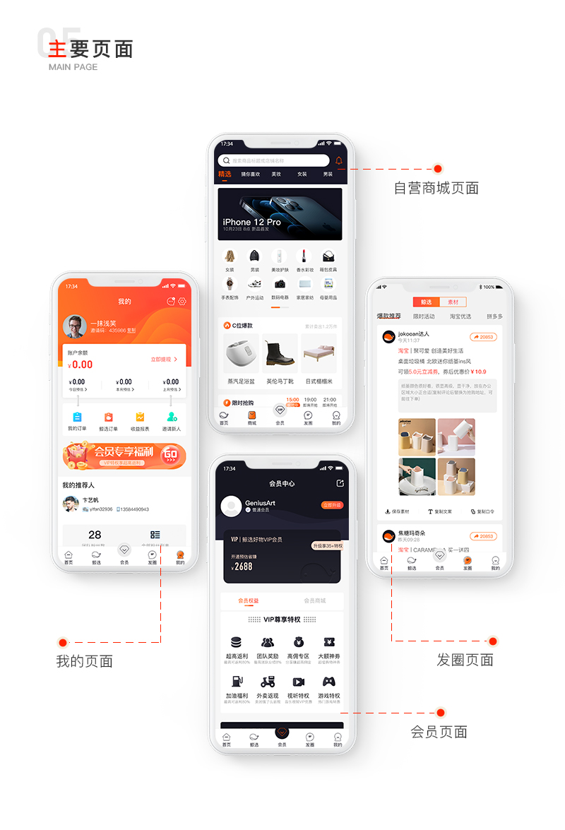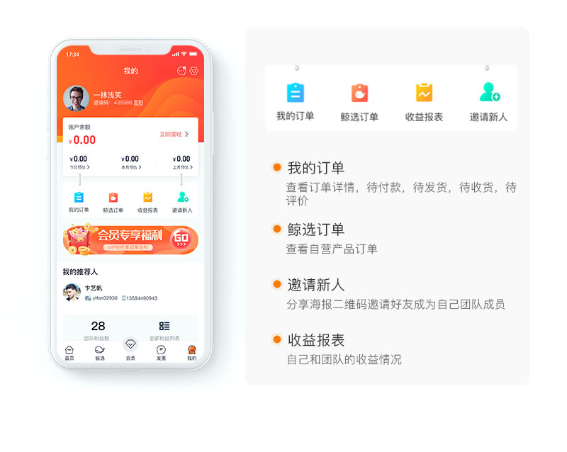 商品展示、會員商城、素材共享、團購專享、海淘精選、限時秒殺、猜你喜歡、個人中心、拉新團隊管理以及收益結(jié)算。